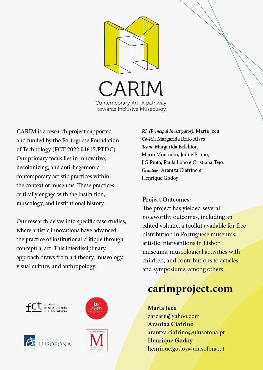 Contemporary Art: A pathway towards Inclusive Museology (C.A.R.I.M) is a research project initiated in 2023, situated in an interdisciplinary perspective at the crosspoint of theory and history of arts and practice, visual culture, anthropology and museology. The project aims to chrystalise strategies that contemporary art (and especially historic and recent conceptual art) can bring into the field of museology, and which can open up de-hegemonic, inclusive and creative methodologies to deal with museologis history, with the institution museum, with display and material culture.